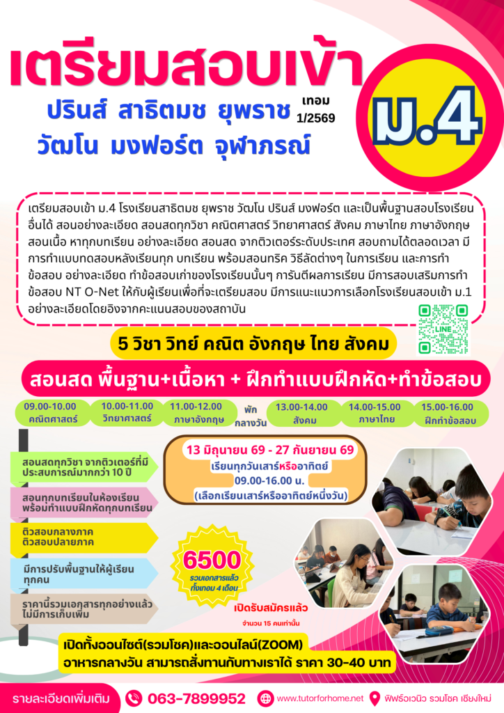 เรียนเตรียมสอบเข้า ม.4 เตรียมความพร้อมสอบเข้าโรงเรียนต่างๆอย่างละเอียดทุกวิชา สอนเนื้อ หาทุก บทเรียน อย่างละเอียด 5 วิชาหลัก วิทยาศาสตร์ คณิตศาสตร์ ภาษาไทย สังคม อังกฤษ ทุกบทเรียนที่ออกสอบเข้าม.1 ยุพราช วัฒโน มงฟอร์ต สาธิต มช ปรินส์ สอนออนไลน์ผ่านระบบ Zoom หรือเลือกเรียน On-site จากติวเตอร์ระดับประเทศ สอบถามได้ตลอดเวลา มีการทำ แบบทดสอบหลังเรียนทุก บทเรียน พร้อมสอนทริค วิธีลัดต่างๆ ในการเรียน และการทำข้อสอบ อย่างละเอียด