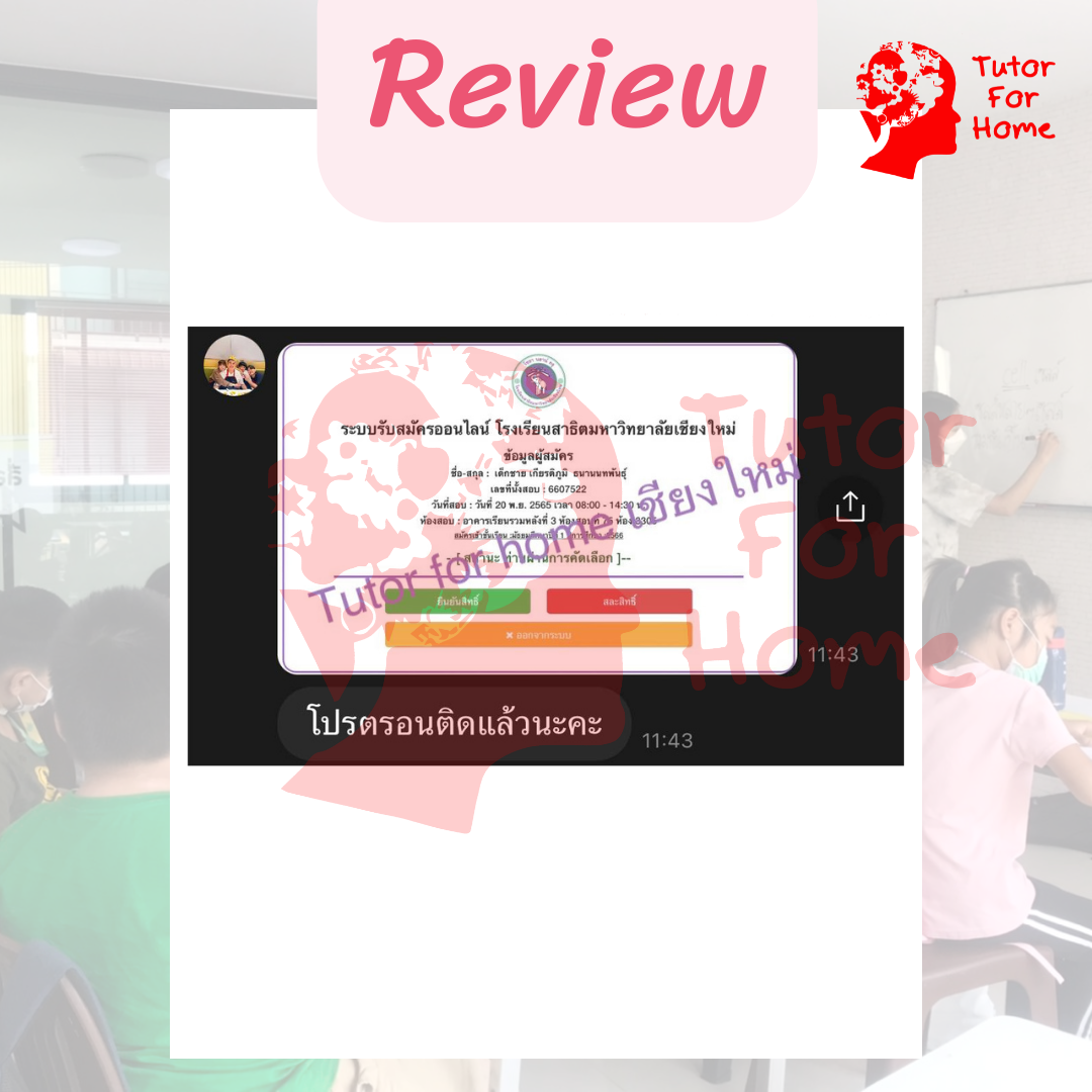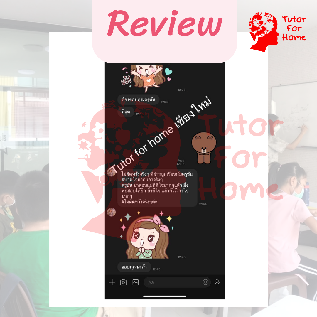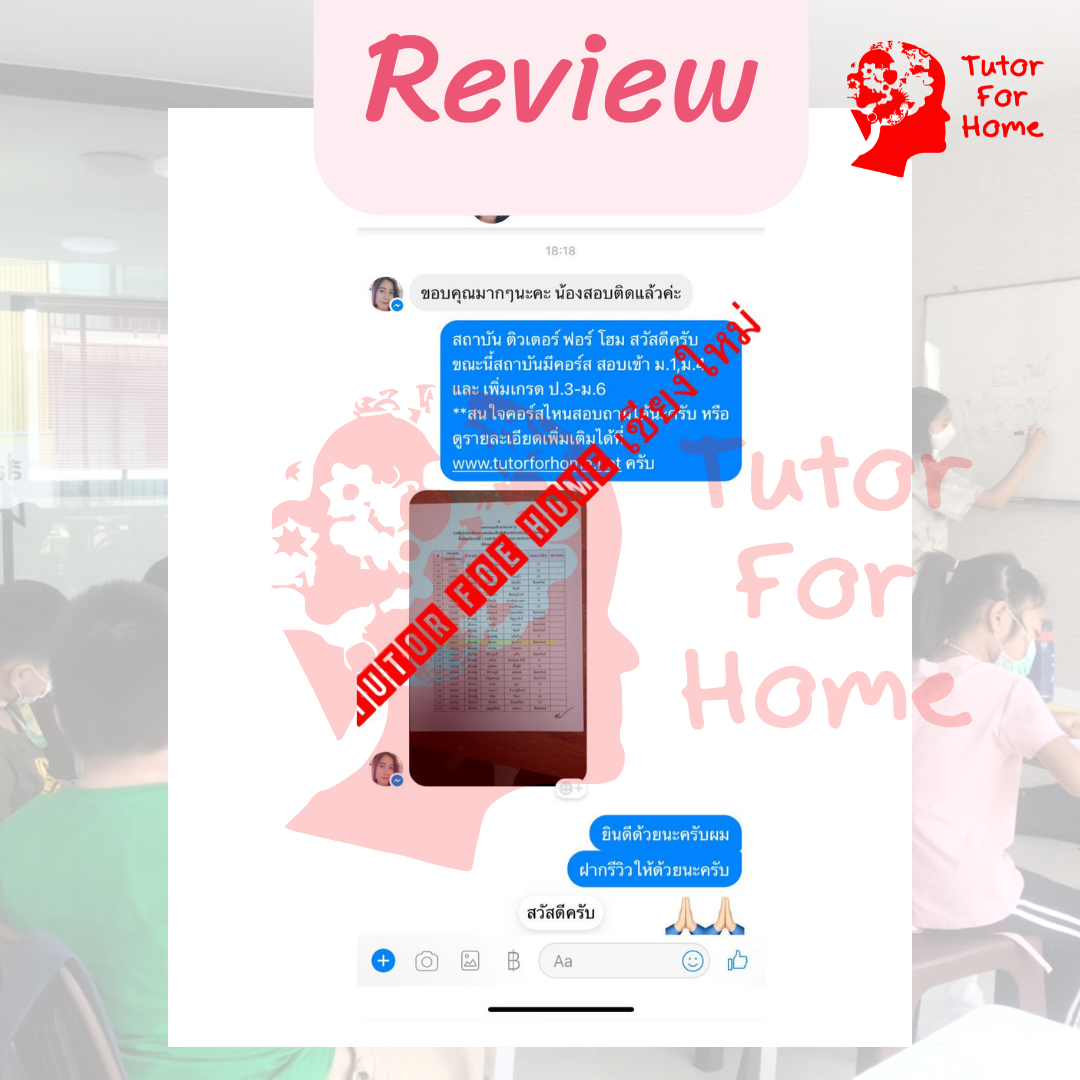 ติวเตอร์ฟอร์โฮม (Tutorforhome) พร้อมที่จะสอนพิเศษ ให้กับน้องๆ ป.1-ม.6 มาเรียนพิเศษ กวดวิชากับสถาบันของเราที่เปิดเป็นคอรสต่างๆ ติวเข้มวิชาต่างๆ โดยติวเตอร์มาจากมหาวิทยาลัยชั้นนำของประเทศ มีทั้งพี่ปริญญาเอก พี่ปริญญาโท พี่ปริญญาตรี จากรั้ว จุฬา ธรรมศาสตร์ เกษตรศาสตร์ พระจอมเกล้าธนบุรี(บางมด) มหิดล มหาวิทลัยเชียงใหม่ ที่ผ่านการคัดเลือกอย่างเข้มข้น ครอบคลุม เขตกรุงเทพ ปริมณฑล เชียงใหม่ ลำพูน และจังหวัดใกล้เคียง รับรองคุณภาพ น้องเรียนพิเศษไปแล้ว เก่ง !! และสอบได้ตามที่ต้องการแน่นอน