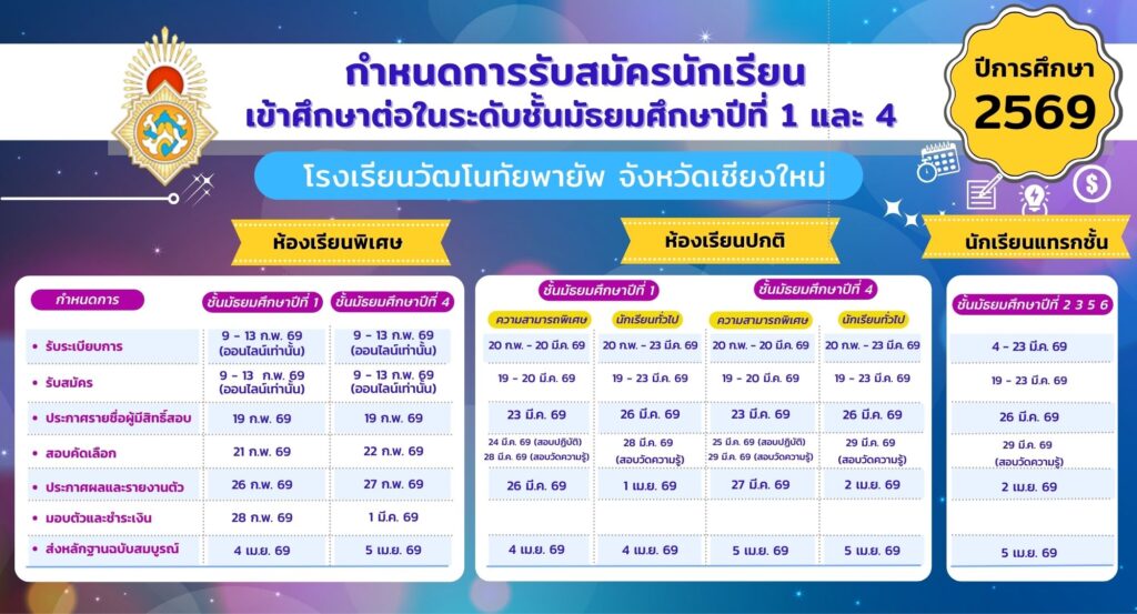 กำหนดการสอบเข้า ม.4 วัฒโนทัยพายัพ เชียงใหม่