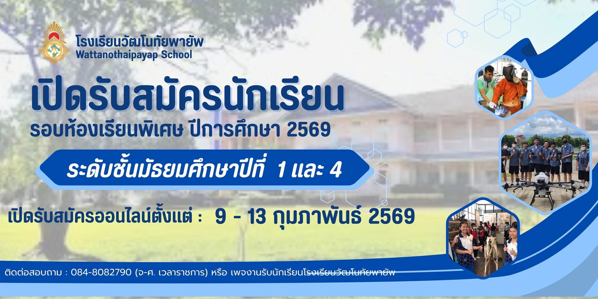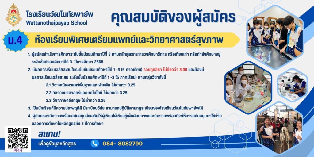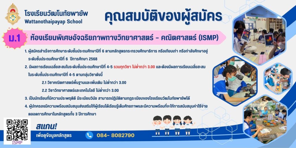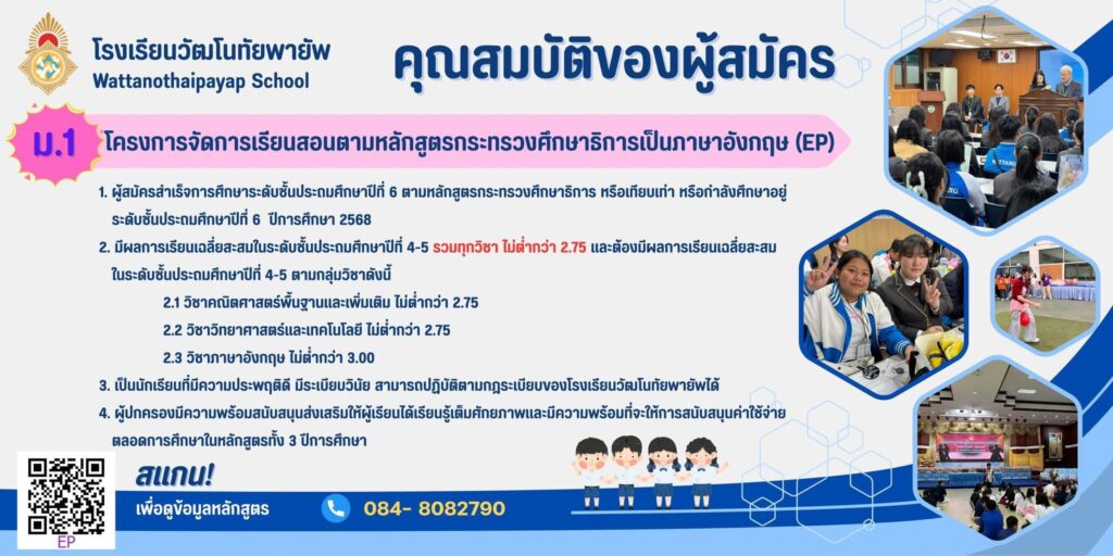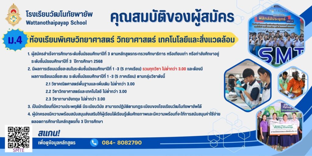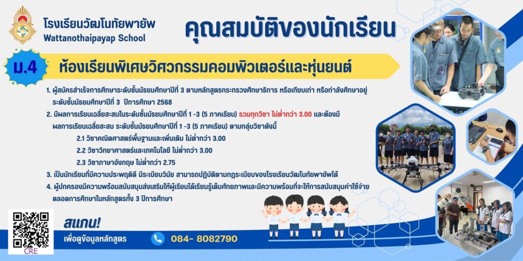 ประกาศโรงเรียนวัฒโนทัยพายัพ เรื่อง การรับสมัครนักเรียนเข้าเรียนระดับชั้นมัธยมศึกษาปีที่ 1 และ 4 ปีการศึกษา 2569 ประเภทห้องเรียนพิเศษ