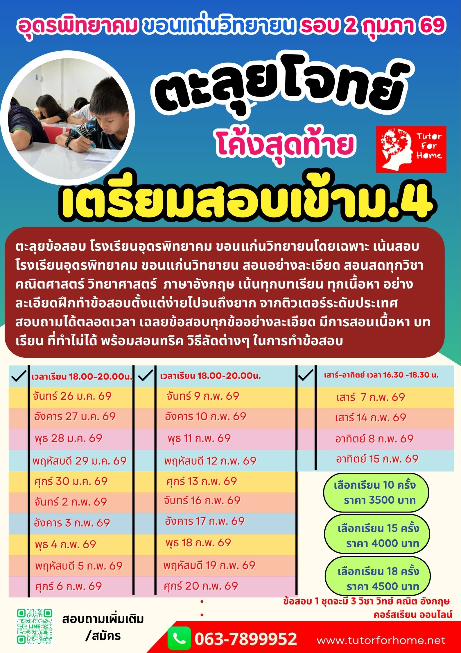 เรียนพิเศษ อุดรธานี เตรียมสอบเข้า ม.1 ม.4 โรงเรียนอุดรพิทยาคม ขอนแก่นวิทยายน อุดรธานี สอนสดติวเข้มวิชาที่สอบอย่างละเอียด เป็นตะลุยโจทย์ เตรียมสอบเข้า ม.1 ม.4 โรงเรียนโรงเรียนอุดรพิทยาคม ขอนแก่นวิทยายน อุดรธานี เรียนพิเศษอุดรธานี กวดวิชาอุดรธานี ที่ Tutor for home อุดรธานีได้เลย