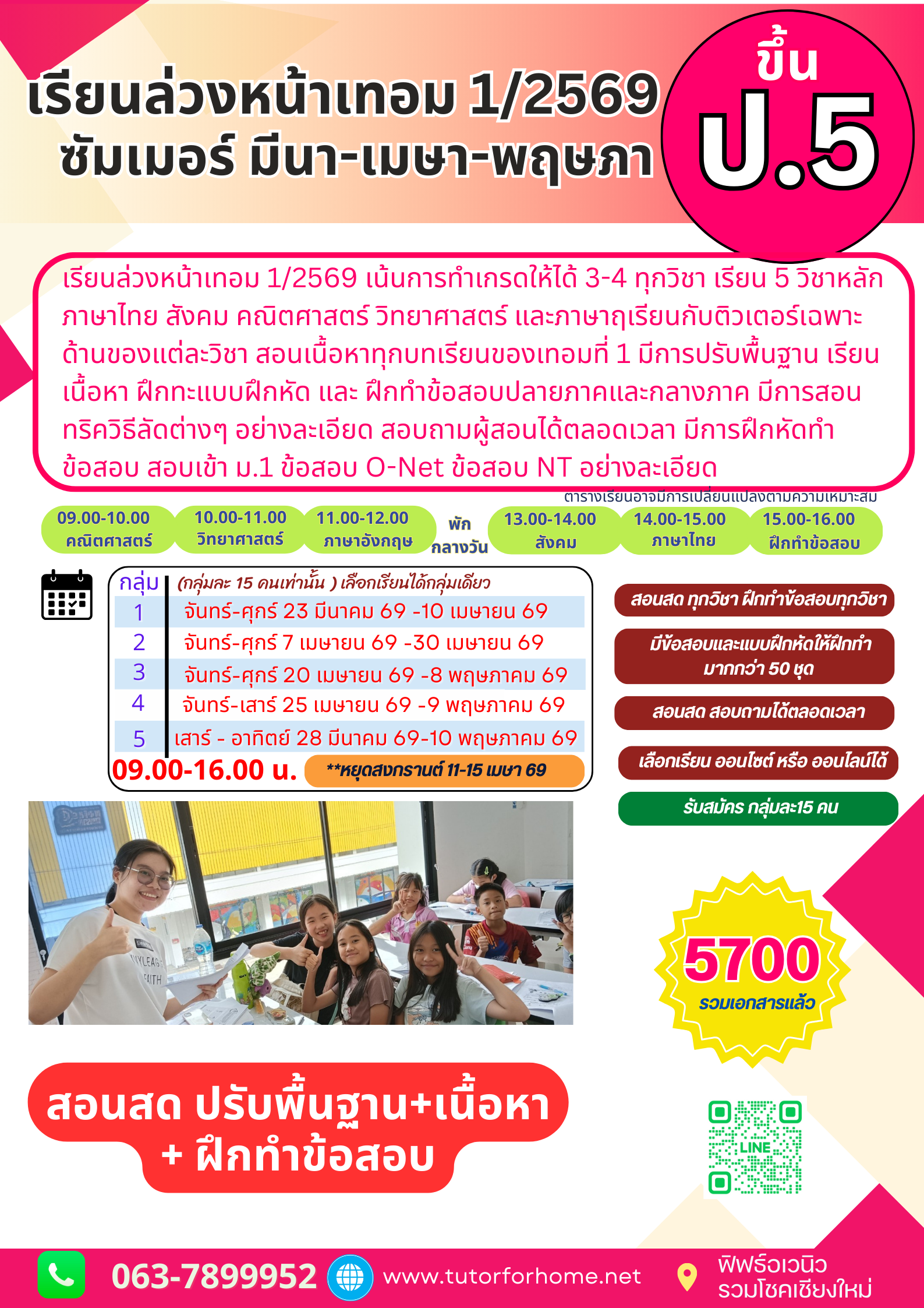 เรียนเพิ่มเกรด ป.5 เตรียมความพร้อมเพิ่มเกรดภาคการเรียน เรียนล่วงหน้าเทอม 1/2569 สอนเนื้อ หาทุก บทเรียน อย่างละเอียด สอนออนไลน์ผ่านระบบ Zoom หรือเลือกเรียน On-site จากติวเตอร์ระดับประเทศ สอบถามได้ตลอดเวลา มีการทำ แบบทดสอบหลังเรียนทุก บทเรียน พร้อมสอนทริค วิธีลัดต่างๆ ในการเรียน และการทำข้อสอบ อย่างละเอียด