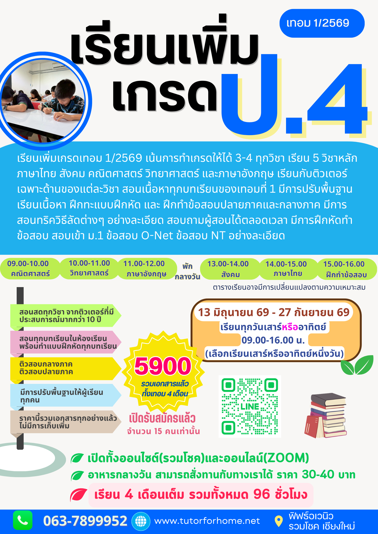 เรียนเพิ่มเกรด ป.4 เทอม 1/2569 เตรียมความพร้อมเพิ่มเกรดภาคการเรียน เทอม 1/2569 แบบทุกรูปแบบสอนเนื้อ หาทุก บทเรียน อย่างละเอียด สอนออนไลน์ผ่านระบบ Zoom หรือเลือกเรียน On-site จากติวเตอร์ระดับประเทศ สอบถามได้ตลอดเวลา มีการทำ แบบทดสอบหลังเรียนทุก บทเรียน พร้อมสอนทริค วิธีลัดต่างๆ ในการเรียน และการทำข้อสอบ อย่างละเอียด