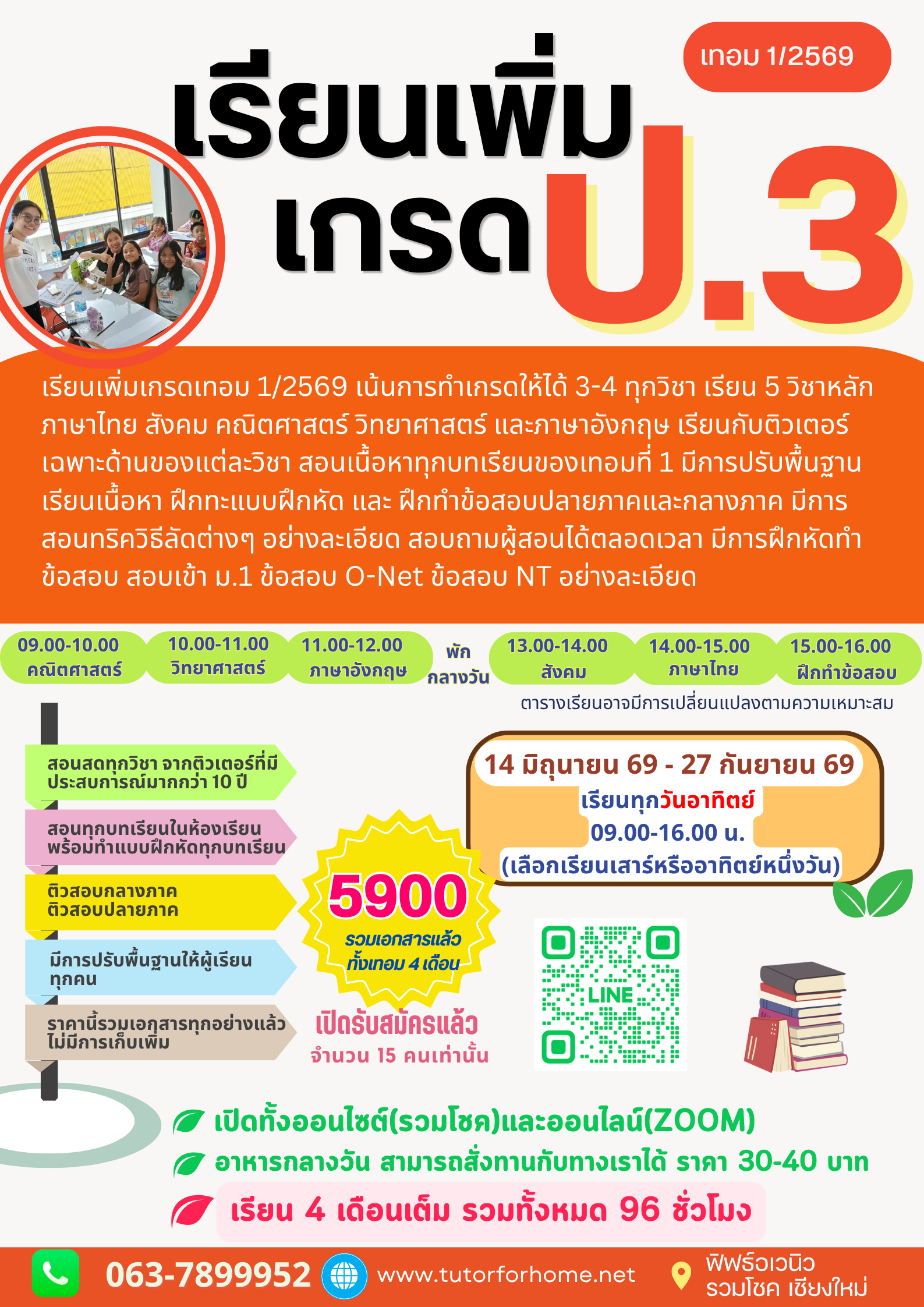 เรียนเพิ่มเกรด ป.3 เทอม 1/2569 เตรียมความพร้อมเพิ่มเกรดภาคการเรียน เทอม 1/2569 แบบทุกรูปแบบสอนเนื้อ หาทุก บทเรียน อย่างละเอียด สอนออนไลน์ผ่านระบบ Zoom หรือเลือกเรียน On-site จากติวเตอร์ระดับประเทศ สอบถามได้ตลอดเวลา มีการทำ แบบทดสอบหลังเรียนทุก บทเรียน พร้อมสอนทริค วิธีลัดต่างๆ ในการเรียน และการทำข้อสอบ อย่างละเอียด