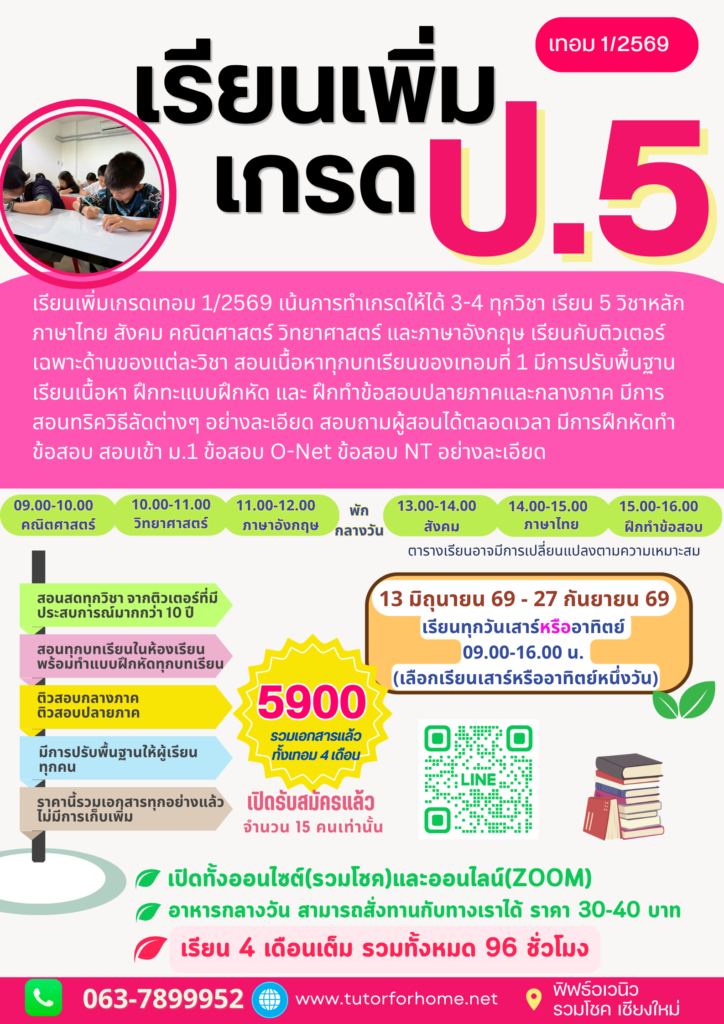 เรียนเพิ่มเกรด ป.5 เทอม 1/2569 เตรียมความพร้อมเพิ่มเกรดภาคการเรียน เทอม 1/2569 แบบทุกรูปแบบสอนเนื้อ หาทุก บทเรียน อย่างละเอียด สอนออนไลน์ผ่านระบบ Zoom หรือเลือกเรียน On-site จากติวเตอร์ระดับประเทศ สอบถามได้ตลอดเวลา มีการทำ แบบทดสอบหลังเรียนทุก บทเรียน พร้อมสอนทริค วิธีลัดต่างๆ ในการเรียน และการทำข้อสอบ อย่างละเอียด