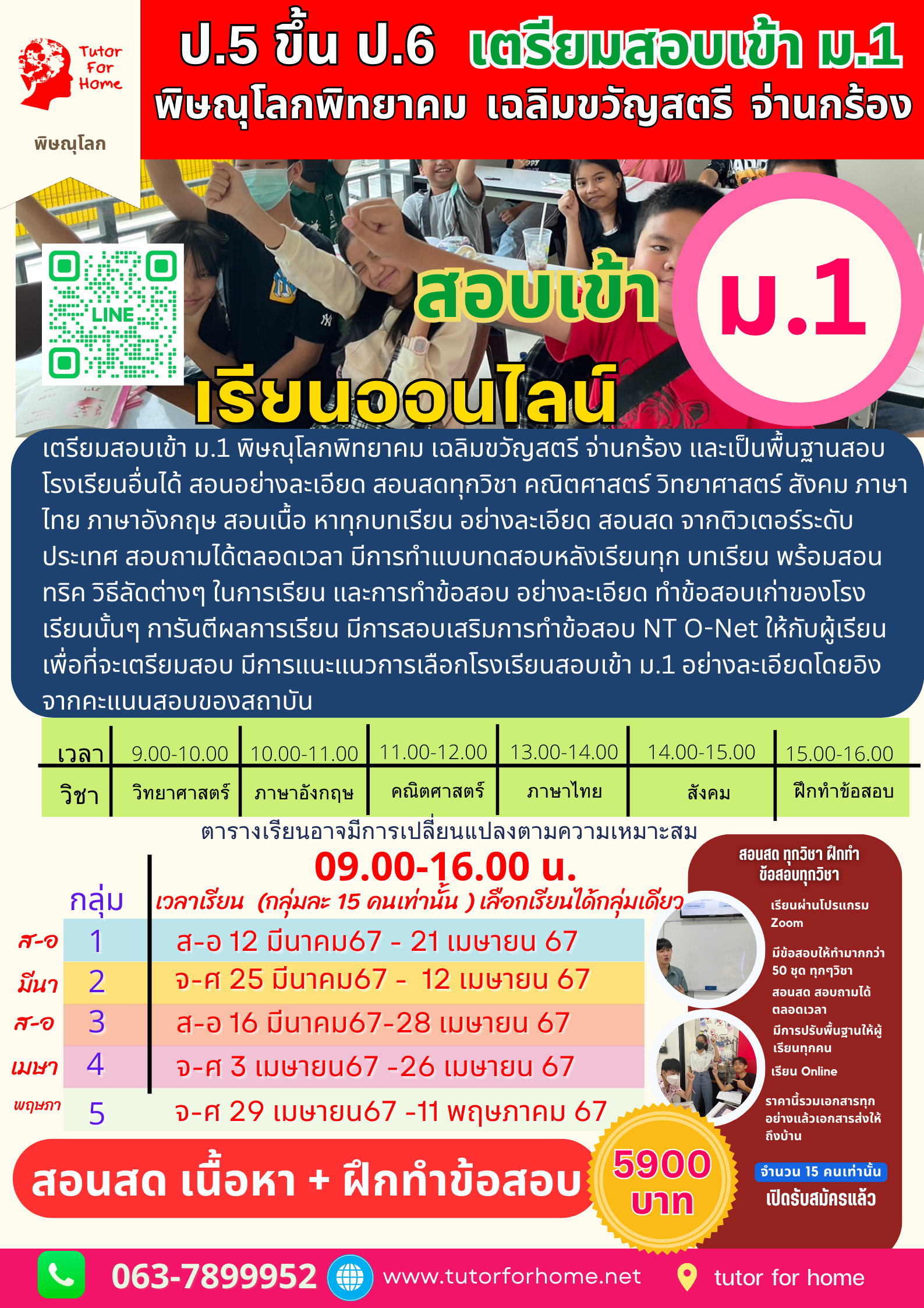 เรียนเพิ่มเตรียมสอบเข้า ม.1 โรงเรียนต่างๆ สอนเนื้อ หาทุก บทเรียน อย่างละเอียด สอนออนไลน์ผ่านระบบ Zoom หรือเลือกเรียน On-site จากติวเตอร์ระดับประเทศ สอบถามได้ตลอดเวลา มีการทำ แบบทดสอบหลังเรียนทุก บทเรียน พร้อมสอนทริค วิธีลัดต่างๆ ในการเรียน และการทำข้อสอบ อย่างละเอียด